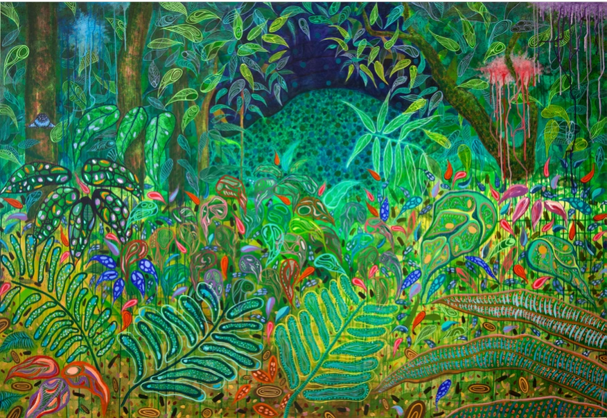 Por este motivo, cuenta, es que en sus últimas obras utiliza como soporte a un papel de fibra de cabuya, la planta que es más conocida como “penco”. “Ese empieza a ser el paisaje en la obra, empieza a ocupar un espacio pictórico, compositivo, pero al mismo tiempo es una capa de significado, un determinador, un punto de especificidad geográfica”, explica Teo.